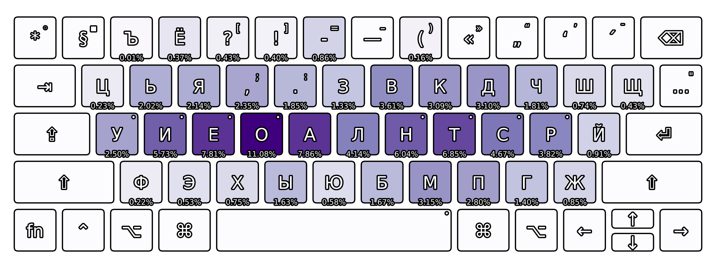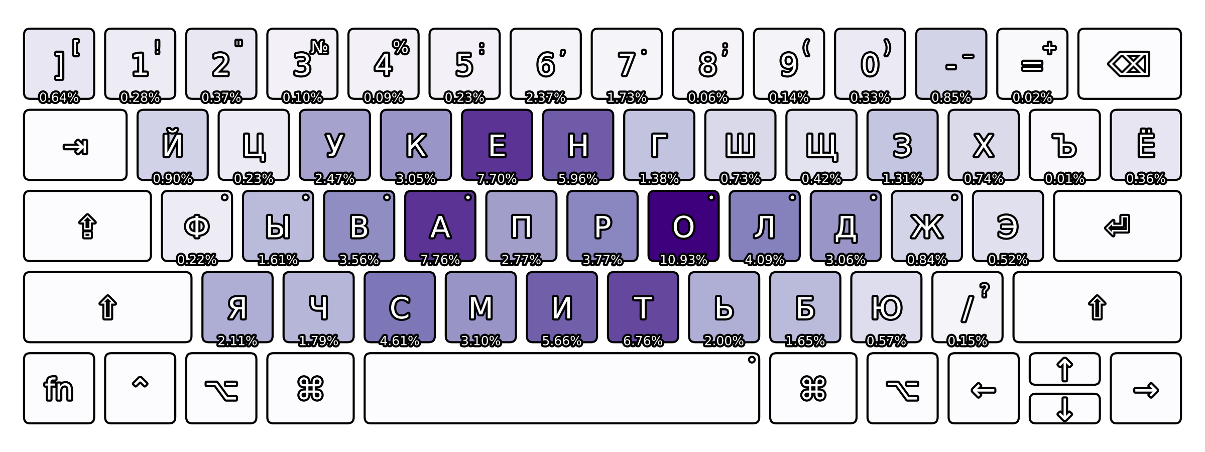 На самом деле, когда мы говорим о частоте использования пальцев, то в первую очередь считаем частоту самих символов в корпусе, а потом просто группируем эти символы по пальцам. Ниже представлена тепловая карта раскладки ЙЦУКЕН. Процентами отмечена частота, с которой набираются буквы, которые представляет текущая клавиша раскладки.