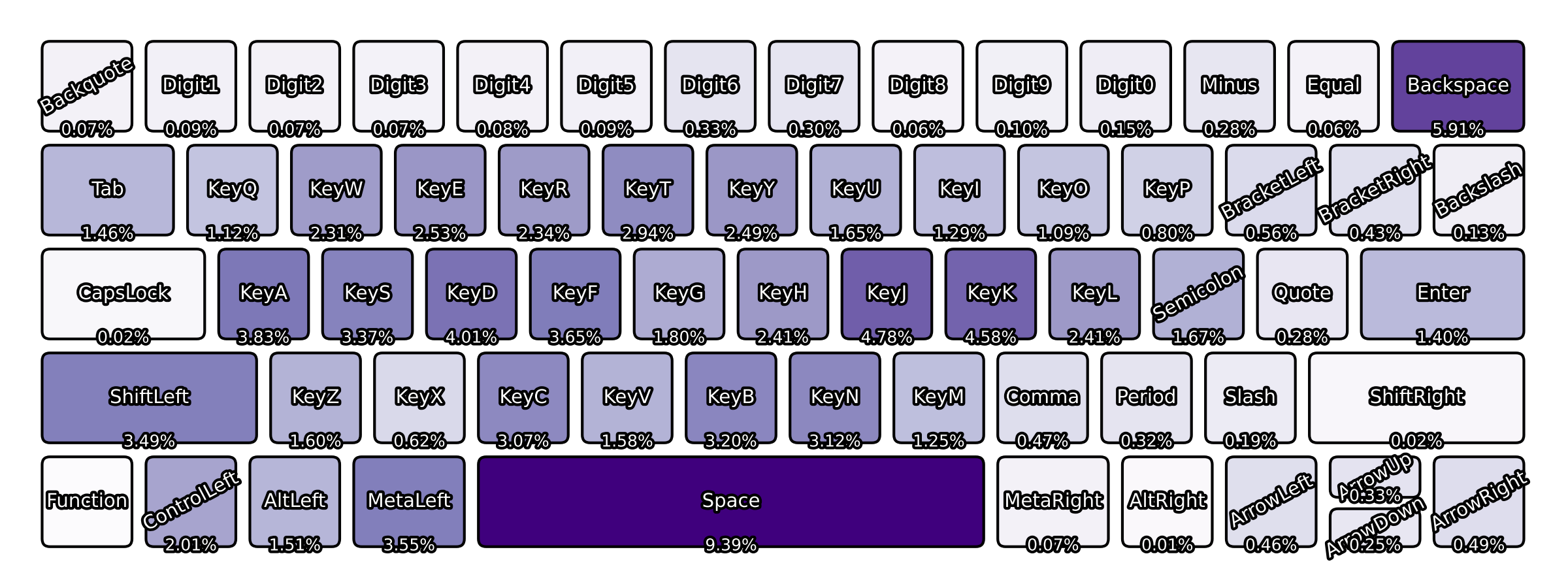 Использование клавиш глобально не является равномерным. Хорошая раскладка использует эти данные чтобы вывести лучший способ набора текста. Ниже представлена тепловая карта использования клавиатуры в целом, собранная среди раскладок ЙЦУКЕН, QWERTY и Colemak. На графике вместо символов отображены коды используемых клавиш раскладки ANSI.